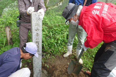 ■先人達の歩いた道を残したいとの思いで、平成23年10月に当会を結成しました。毎月一回、手弁当で集まり、登山道の草刈り、手作りの道路標識の設置、階段作りや道路の整備・補修、ベンチ作り等々の作業をしています。