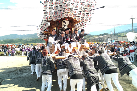 実りの秋の収穫に感謝し、御神霊に神輿にて御旅所(比叡の前)へ神幸していただきます。20台近くの地車(だんじり)が宮入りし、神輿を中心に全地車が参集した風景は河内随一と言われます。各地区青年団が地車の舞台上より「河内にわか」(即興の寸劇)を奉納上演します。