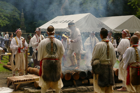 開祖役行者の命日である7月7日に、役行者の遺徳を偲び護摩木を投じて祈祷した後に、100名ほどの山伏行者が火渡り修行を行います。火渡り修行にはどなたでも参加でき、修行の後には除災招福の御札をいただくことができます。