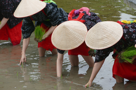 「早乙女」とは「田植えをする女性」を意味し、田植えを始めるに先立って神様を田んぼにお迎えする神事です。例年多くのカメラ愛好家が集まり、大賑わいとなります。